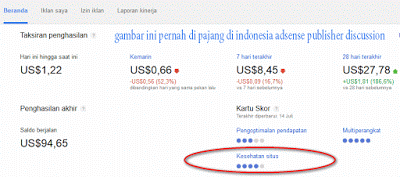 Pantau dan pastikan kesehatan situs/blog anda di google webmaster tools, sebab di beranda adsense (gambar) sudah tercantum demikian, jika kesehatan situs/blog anda kurang baik, bisa jadi itu penyebab menurunnya penghasilan google adsense.