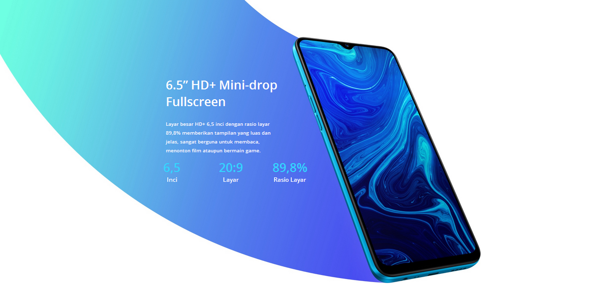 | Layar | IPS LCD, 6.5-inchi, HD+ (720 x 1600 pixels), 20:9 aspect ratio, 480 nits of brightness Gorilla Glass 3 |