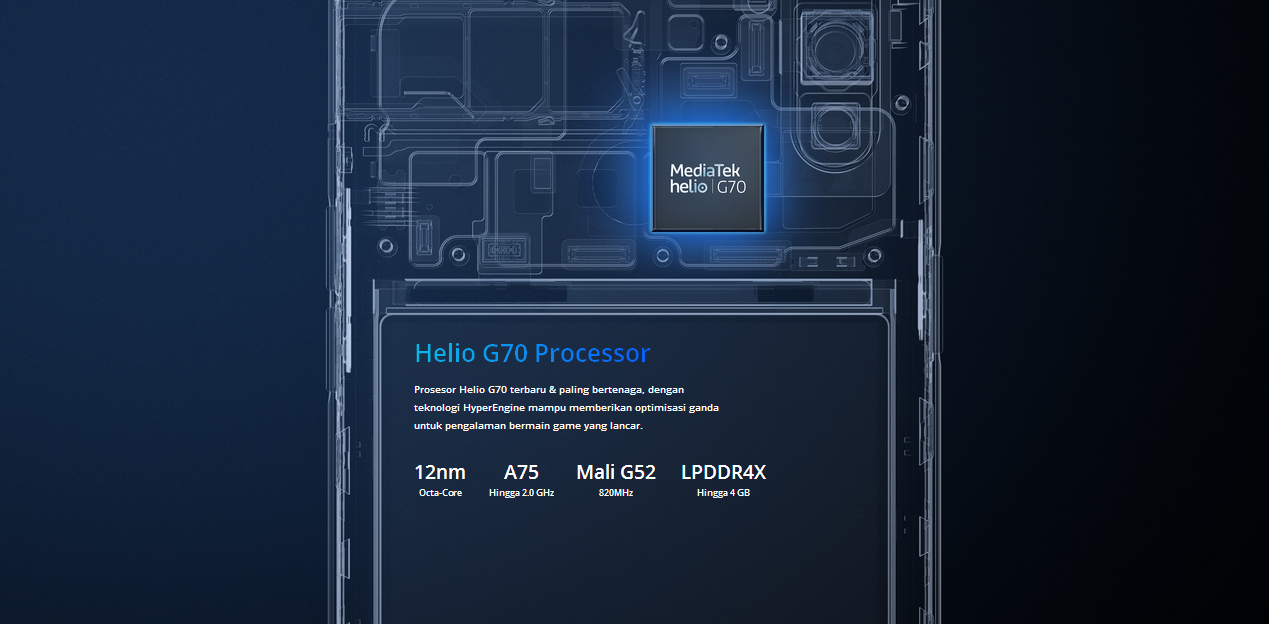 Helio G70 merupakan salah satu SoC di keluarga Helio G-Series yang telah di-optimisasikan untuk keperluan gaming. G70 difabrikasi menggunakan teknologi 12nm process dan mengusung 8x CPU Cores yang terdiri dari 2x 2.0 GHz Cortex-A75 dan 6x 1.7 GHz Cortex-A55 dengan Mali-G52 2EEMC2 GPU utuk menangani pekerjaan grafis.