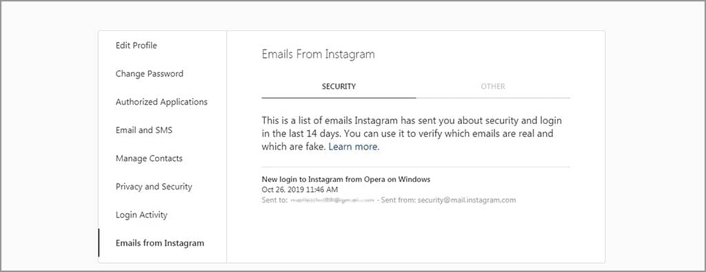 Pada pembahasan sebelumnya sudah disampaikan jika tab keamanan berisi daftar email resmi yang dikirim oleh pihak Instagram terkait keamanan akun dan aktivitas login dalam 14 hari terakhir. Adapun untuk tab lainnya berisi daftar email selain pemberitahuan keamanan, dikirim oleh pihak Instagram dalam 14 hari terakhir pula.