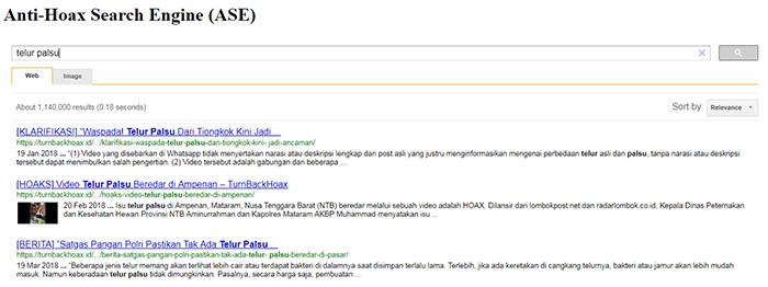 Pencarian Hoax: Tools ini mirip dengan ASE, karena menampilkan klarifikasi terhadap konten-konten yang dimunculkan. Namun, pencarian tools ini hanya berkutat di situs turnbackhoax.id.
