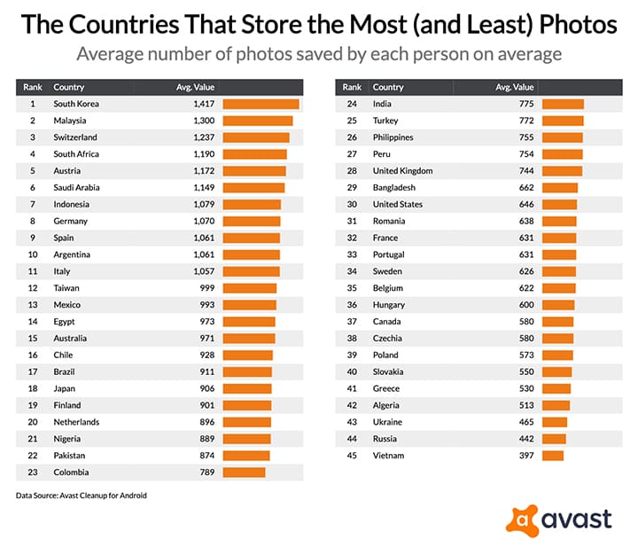 Berdasarkan laporan Avast, Korea Selatan menjadi negara dengan koleksi foto terbanyak. Negara tetangga Korut tersebut, rata-rata menumpuk foto di ponsel mereka sebanyak 1.417. Di bawah Korea Selatan ada nama Malaysia dengan 1.300 foto.