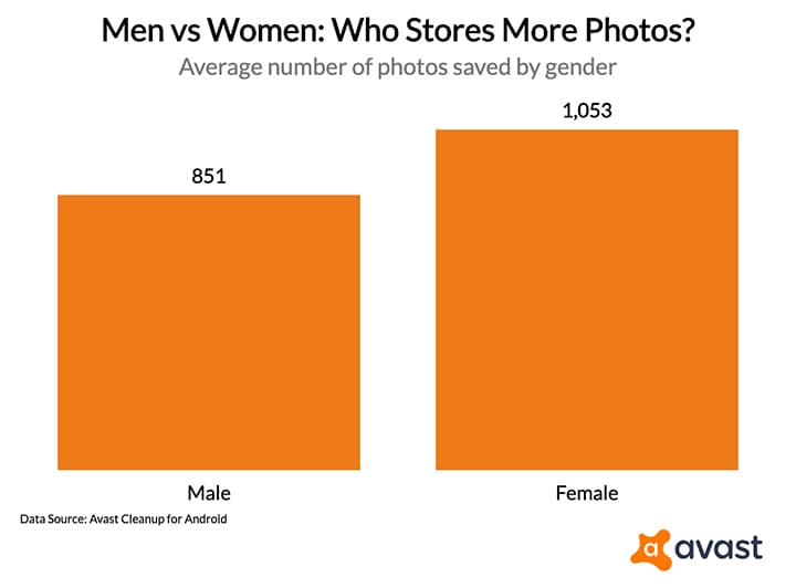 Menurut laporan Avast, persentase para perempuan untuk menyimpan foto jauh lebih banyak dari para pria, yaitu sebesar 24 persen. Para perempuan rata-rata menyimpan foto sebanyak 1.053, sedangkan para pria menyimpan foto sebanyak 851.
