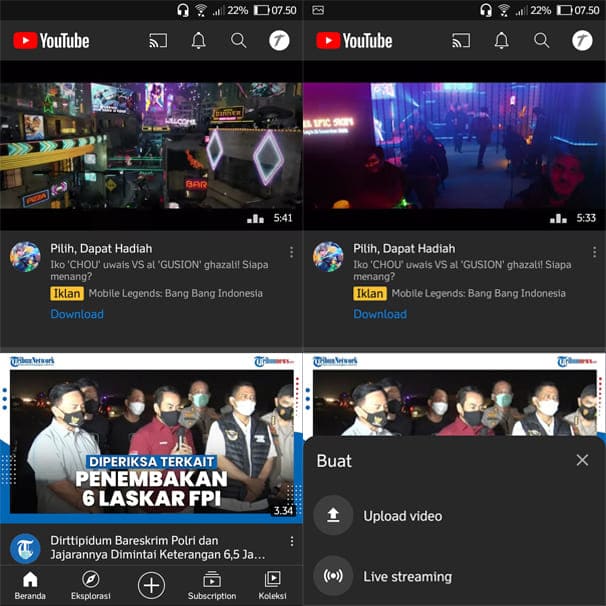 3. Ketuk ikon tambah ketika aplikasi Youtube sudah terbuka, kemudian pilih upload video.