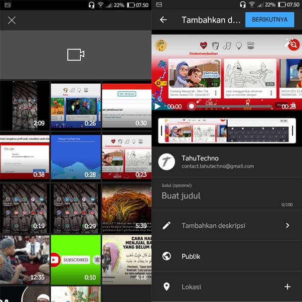 4. Pilih video yang sudah dibuat. Setelah itu isi judul, deskripsi, dan kemudian ketuk berikutnya.