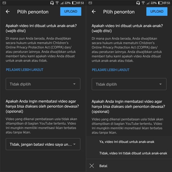 5. Pada pertanyaan apakah video ini dibuat untuk anak-anak, pastikan kamu memilih jawaban ya, video ini dibuat untuk anak-anak, kemudian pilih upload.