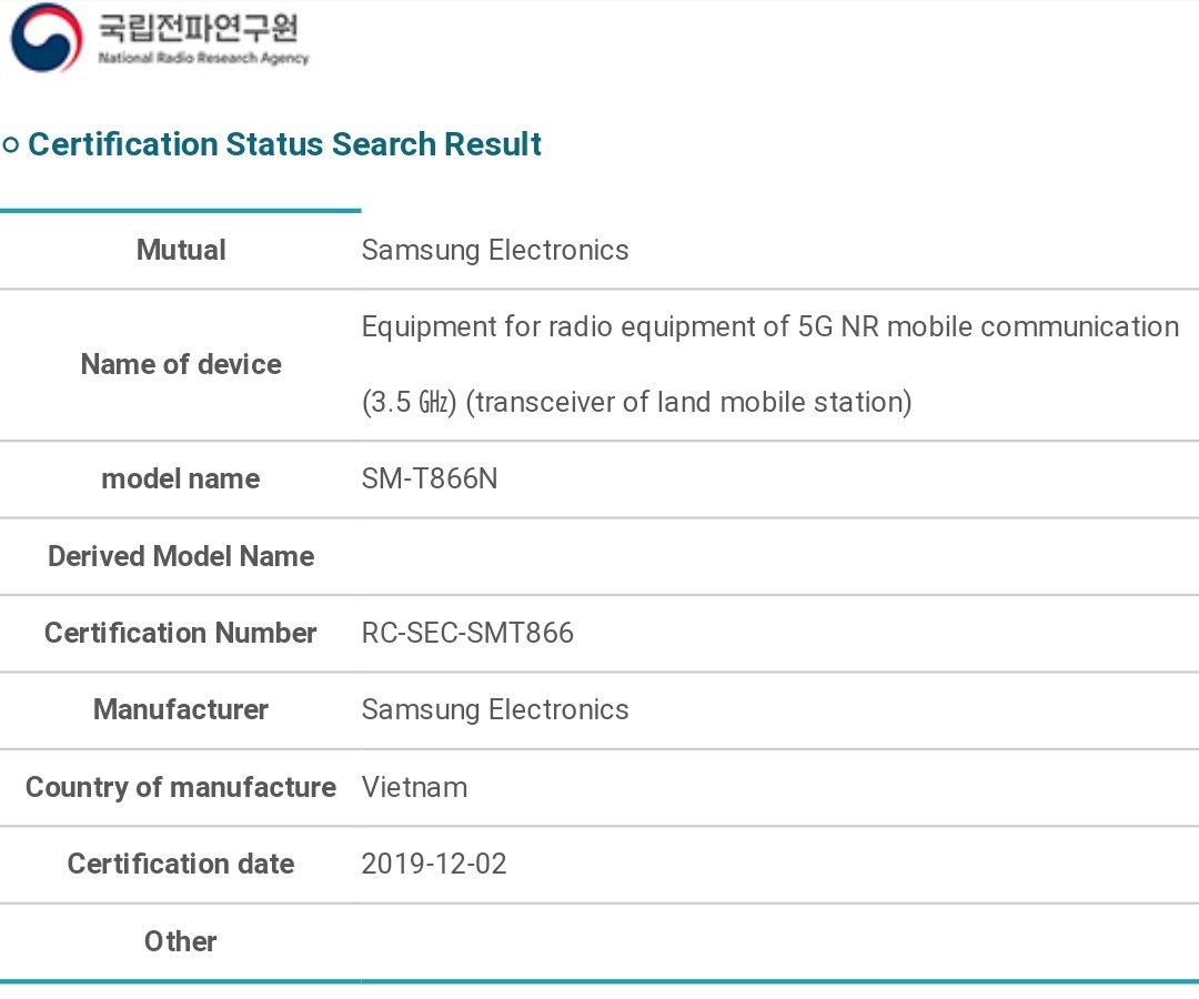Kemungkinan, tablet tersebut akan dirilis dalam waktu dekat. Beberapa bulan yang lalu, perangkat dengan model number SM-T866N juga telah memperoleh sertifikasi Bluetooth dan Wi-Fi Alliance. Dan kali ini, perangkat tersebut juga telah menerima sertifikasi dari NRRA (National Radio Research Agency) Korea Selatan.