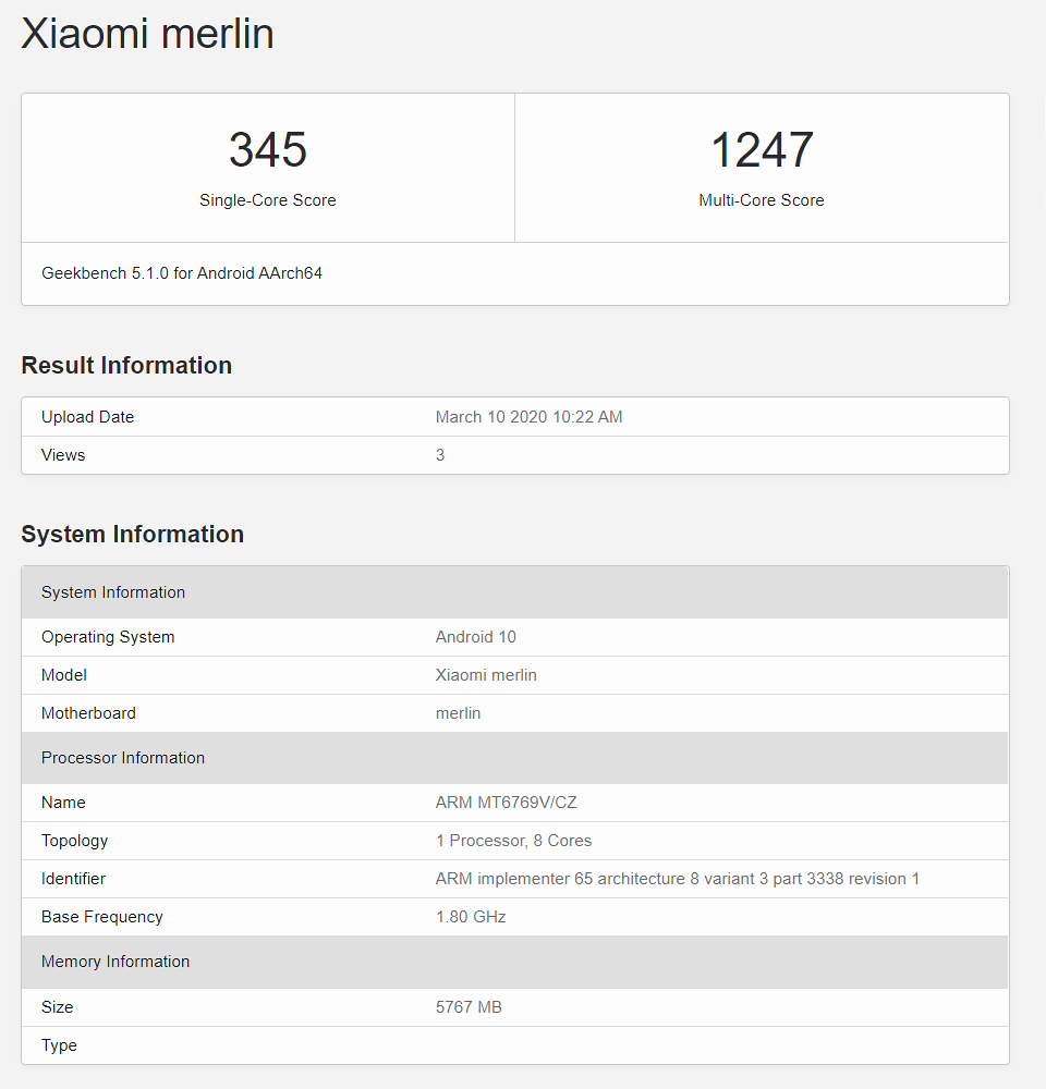 Xiaomi Merlin terlihat menggunakan MediaTek 6769V/CZ yang tidak lain adalah MediaTek Helio G70 SoC. Tentu saja, performa Helio G70 masih dibawah Snapdragon 720G berdasarkan skor yang didapatkan oleh Redmi Note 9 Pro.
