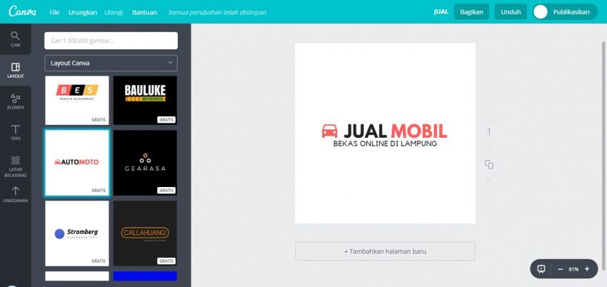 Langkah Ketiga : Gunakan area kerja Layout Canva untuk menemukan salah satu “layout” yang sesuai dengan kriteria.