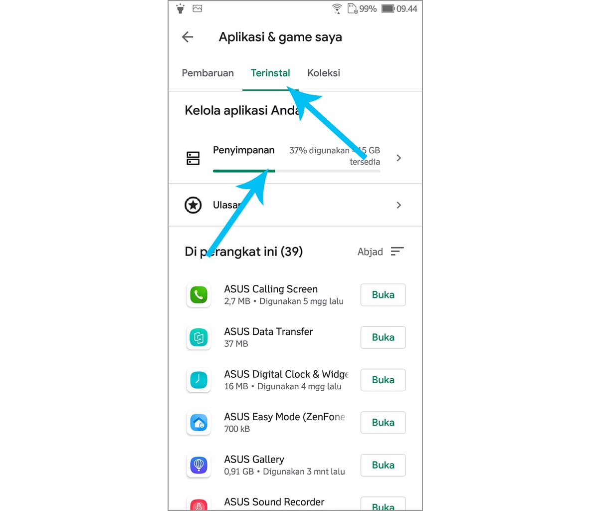 4. Ketuk terinstal, kemudian ketuk penyimpanan.