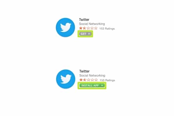 3. Langkah Ketiga, karena Twitter adalah aplikasi gratis, maka tombol tidak berupa harga melainkan “Get”. Pilih aplikasi twitter lalu klik tombol hijau Install App.
