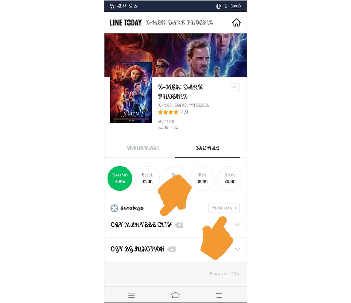 7. Solusinya, Anda bisa memilih kota di mana Anda tinggal dengan mengetuk pilih kota. Misal, Anda tinggal di Surabaya, maka silakan ketuk pilih kota > Surabaya. Dan hasilnya, bioskop yang menayangkan film X-Men akan ditampilkan.
