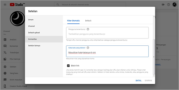 Sebenarnya, untuk memblokir link dan kata-kata yang tidak pantas bisa dilakukan di Creator Studio. Namun karena YouTube akan segera mengganti Creator Studio dengan YouTube Studio, memilih YouTube Studio adalah pilihan yang tepat.