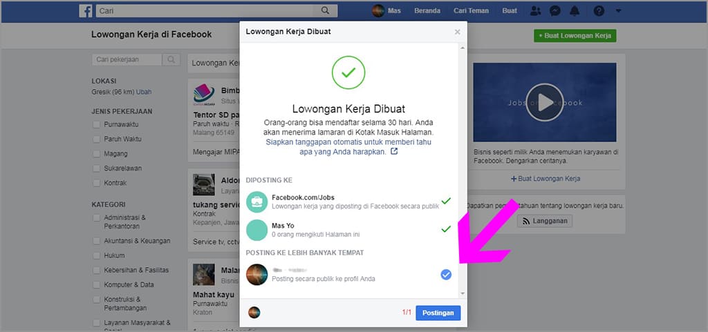 7. Lowongan kerja berhasil dibuat, Anda juga bisa menambahkannya ke lini masa pribadi dengan cara klik atau centang di profil Anda, kemudian klik postingan.