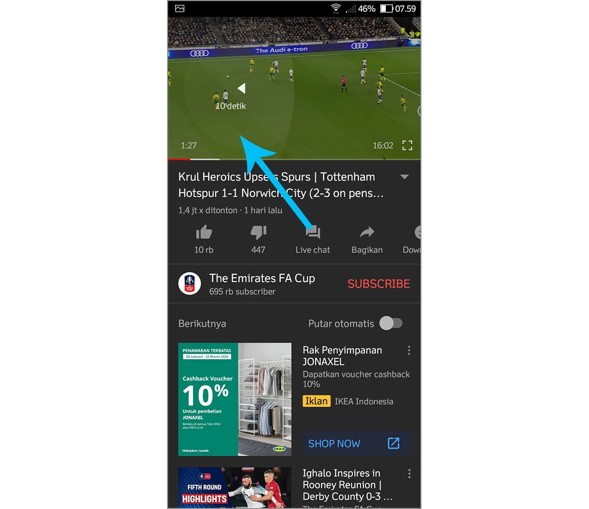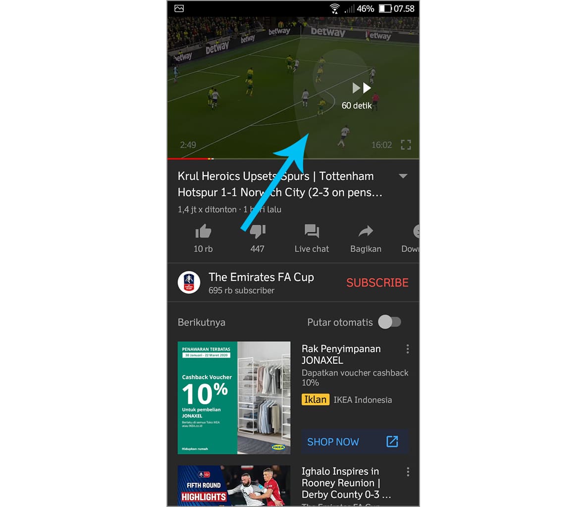 3. Untuk mulai mempercepat dalam beberapa detik, silakan sentuh pada bagian kanan video sebanyak dua kali, dan video akan dipercepat sebanyak 10 detik. Kecepatan video sendiri tergantung jumlah sentuhan, jika sentuhan dua kali itu dilakukan sebanyak 6 kali, maka video akan dipercepat sebanyak 60 detik.