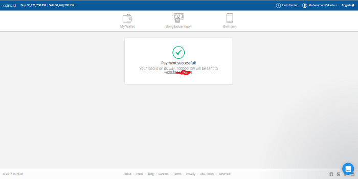 4. Step terakhir adalah nominal yang harus di bayar untuk membeli pulsa gratis dengan saldo Bitcoin dari App.coins.id.