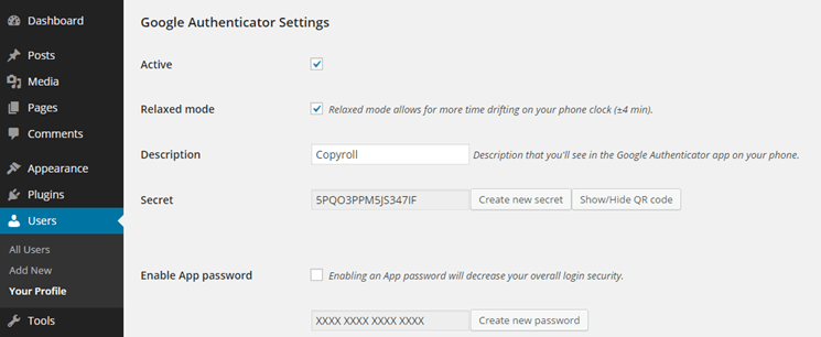 Setelah itu klik menu Users > Your Profile kemudian pilih Google Authenticator Setings. Jika Anda menggunakan handphone baru silahkan tekan Create new secret pada setingan plugin. QR code baru akan tampil, silahkan scan menggunakan handphone baru Anda. Cara ini sama seperti ketika kita mengaktifkan two-factor authentication dan menghubungkan dengan aplikasi FreeOTP pada Langkah 3.