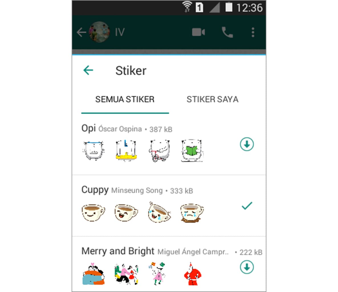 8. Ketika stiker berhasil diunduh, maka tombol download akan berubah menjadi centang.