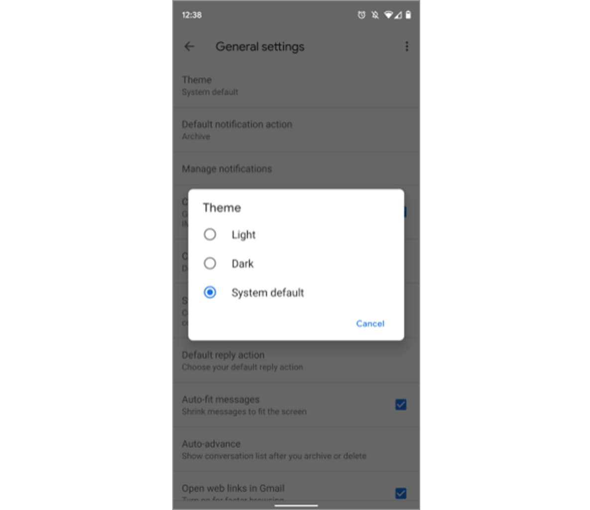 6. Silakan pilih dark, maka aplikasi Gmail akan masuk ke mode gelap.