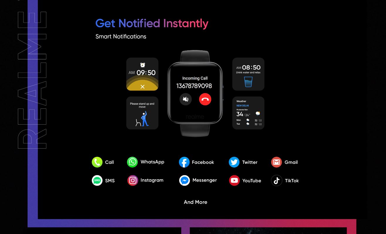 Realme Watch akan menyediakan fitur seperti smart notifications untuk aplikasi seperti Facebook, WhatsApp, Twitter, Gmail, Instagram, Messenger, YouTube, TikTok, SMS, dan masih banyak lagi. Pengguna juga dapat mengendalikan musik dan kamera melalui Realme Watch.