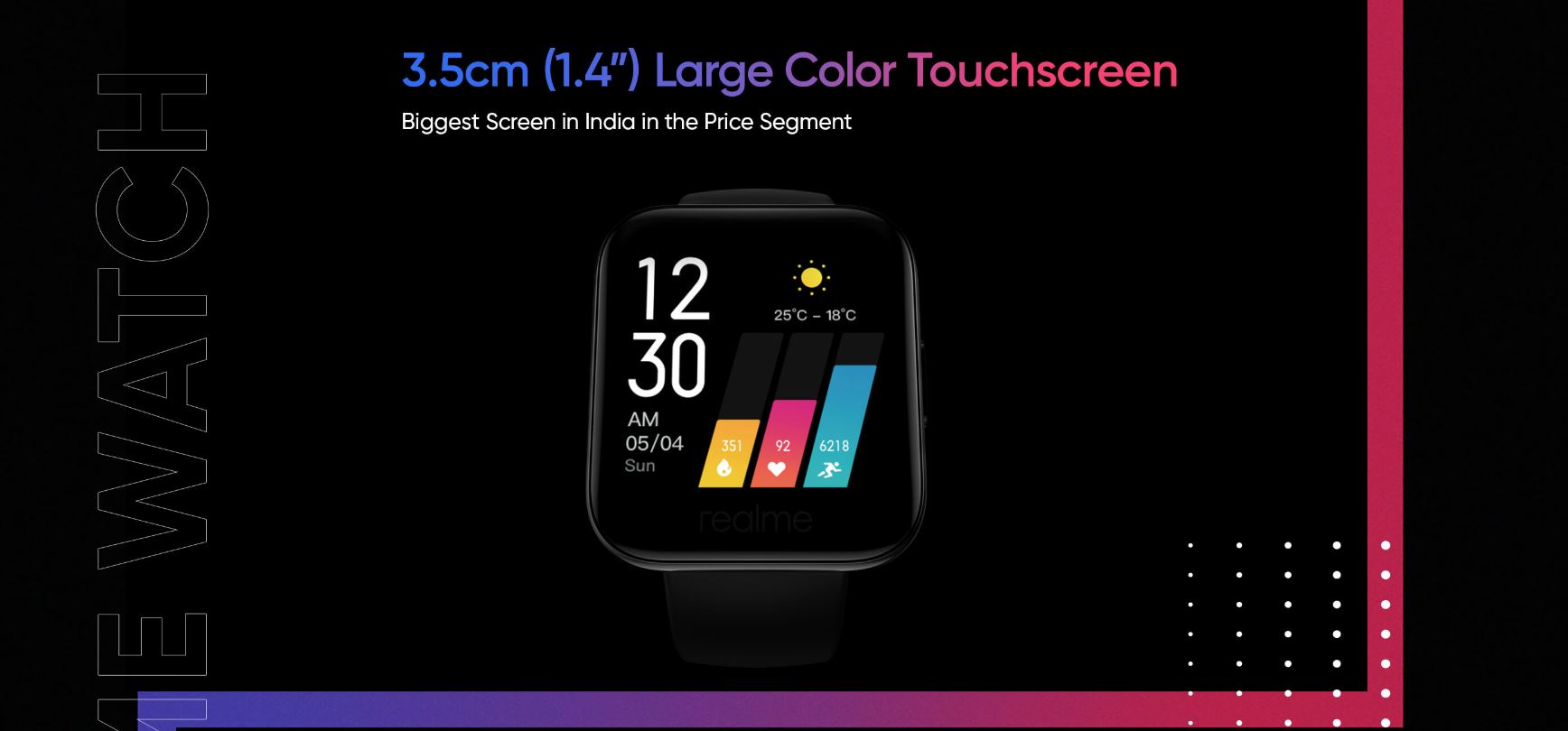 Realme sendiri mengklaim bahwa Realme Watch akan mengusung layar terbesar yang pernah di-gunakan oleh smartwatch pada segmen harga yang ditargetkan untuk jam pintar tersebut.