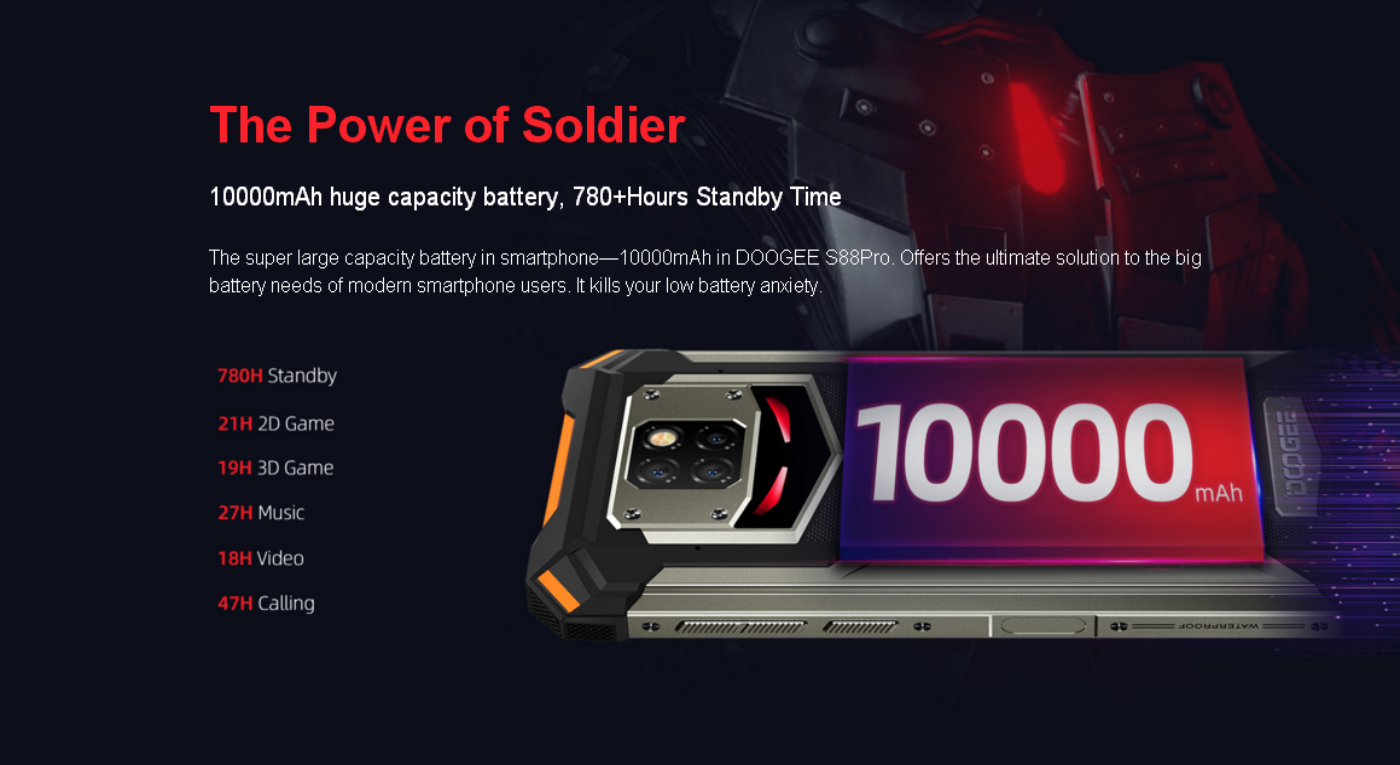 Menurut Doogee, baterainya mampu memberikan waktu 3D Game hingga 19 Jam, 1 bulan Standby, 27 Jam musik, 18 Jam video, dan 47 Jam waktu bicara. Untuk pemakaian biasa, S88 Pro mampu bertahan sampai 7 hingga 8 hari dalam sekali full charge.