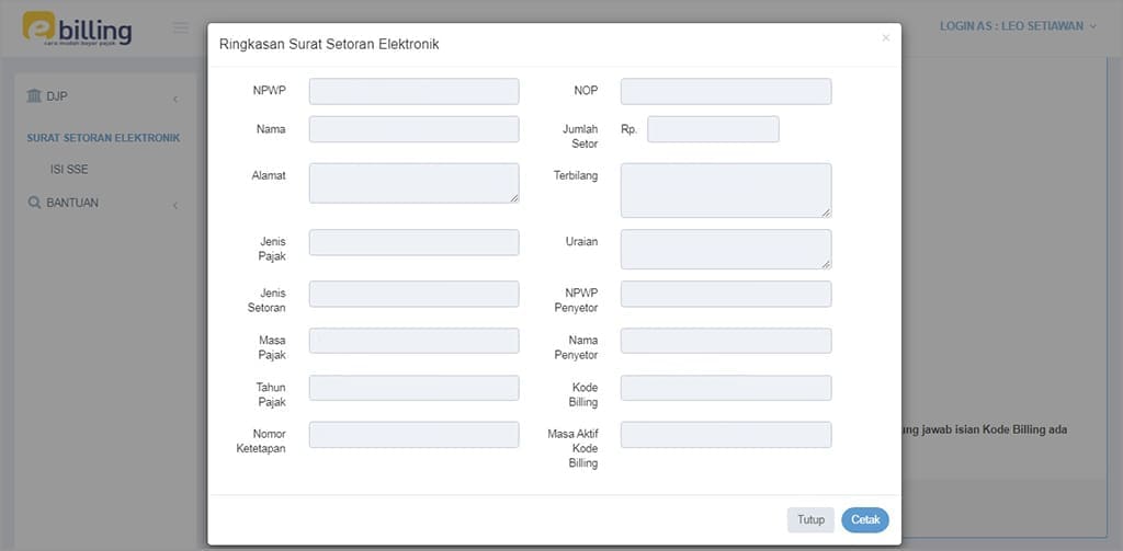 Dengan tampilannya yang baru ini, ternyata proses untuk membuat kode billing pun juga semakin cepat. Jadi, ketika Anda sudah login, kemudian memilih e-Billing, Anda akan langsung disuguhkan form surat setoran elektronik seperti gambar di atas.