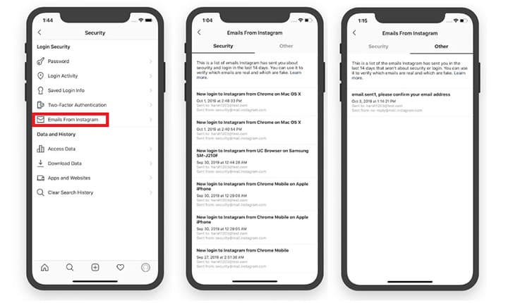 Ketika para pengguna mengakses fitur emails from Instagram, mereka akan menjumpai dua tab yang bisa diakses, yaitu tab keamanan dan juga tab lainnya. Kedua tab pun memiliki atau berisi daftar email yang berbeda-beda.