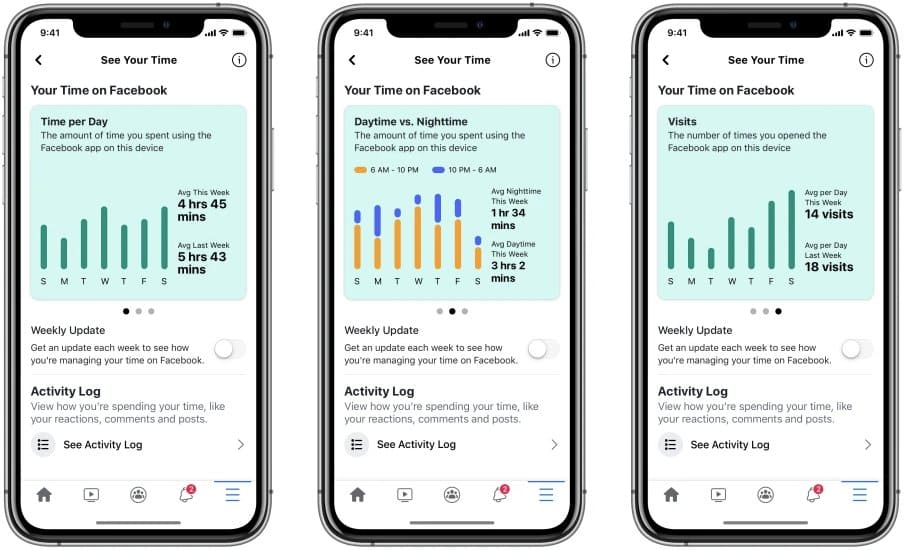Waktu Anda di Facebook atau your time in Facebook juga telah diperbarui oleh pihak perusahaan. Facebook pertama kali memperkenalkan daftar waktu yang dihabiskan pada tahun 2018, namun pembaruan kali ini memberikan pengalaman yang lebih luas kepada para pengguna.