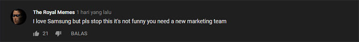 Dalam reaksinya yang berupa komentar di saluran YouTube Samsung, The Royal Memes menuliskan jika sebaiknya Samsung menghentikan iklan yang penuh sindiran. Selain itu, The Royal Memes juga menuliskan jika Samsung membutuhkan tim pemasaran baru.