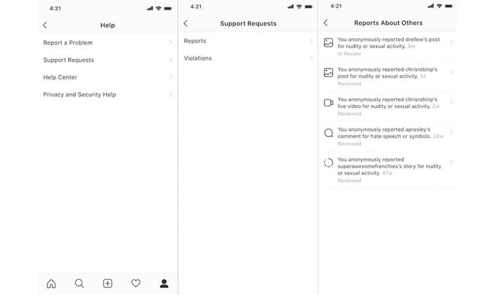 Seperti yang Anda lihat dalam urutan di atas, laman bantuan Instagram Anda akan kedatangan fitur baru, yaitu support requests. Dengan mengetuk support requests, maka Anda akan dapat melihat daftar lengkap dari laporan apa pun yang telah Anda kirimkan via aplikasi.