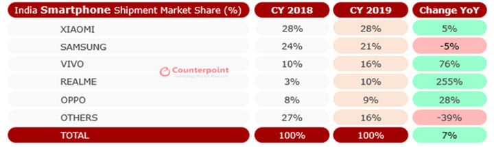 Adapun untuk merek lain seperti Samsung, pertumbuhan mereka di pasar India pun tidak terlalu mengesankan. Ponsel pintar keluaran Samsung nyaris tidak mengalami pertumbuhan atau stagnan, bahkan Samsung harus rela penjualannya turun sebanyak 5 persen pada tahun 2019.