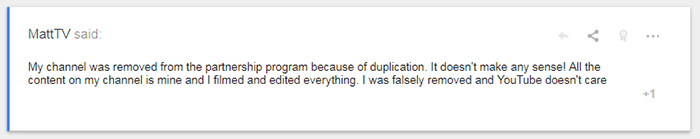 MattTV mengatakan, bahwa YouTube menghapus semua videonya. Padahal, MattTV tidak menduplikasi video orang lain, melainkan membuat karya orisinal.