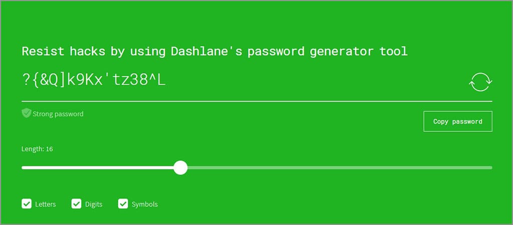 Ketika Anda membuka tautan menuju ke Dashlane, maka Anda akan langsung disuguhkan kata sandi yang bisa Anda gunakan. Pihak Dashlane akan memberikan kata sandi yang panjangnya 16 karakter. Namun Anda bisa mengubahnya menjadi lebih pendek. Untuk mendapatkan sandi baru, Anda hanya perlu menyegarkan halaman Dashlane.