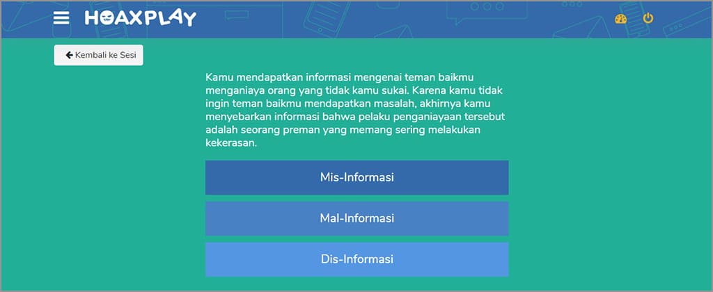 Ketika Anda mengikuti pembelajaran dari tahap satu ke tahap selanjutnya, maka Anda akan menjumpai kuis yang harus diisi. Hasil kuis itu nantinya akan berguna atau bisa dijadikan tolok ukur seberapa besar Anda mengetahui hoaks.