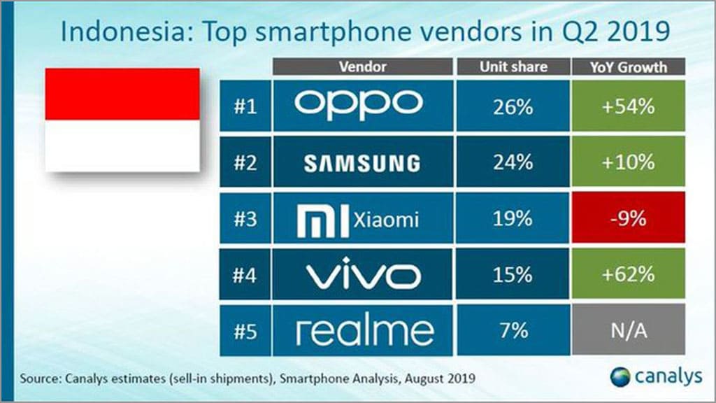 Di Indonesia, posisi Samsung sudah tergeser oleh Oppo. Kemudian, di posisi ketiga juga diisi oleh produk China, yaitu Xiaomi. Keadaan ini sama persis dengan negara Filipina di mana Oppo menduduki posisi pertama dan Samsung di posisi kedua. Yang membedakan hanya di posisi ketiga di mana posisinya diisi oleh Vivo.