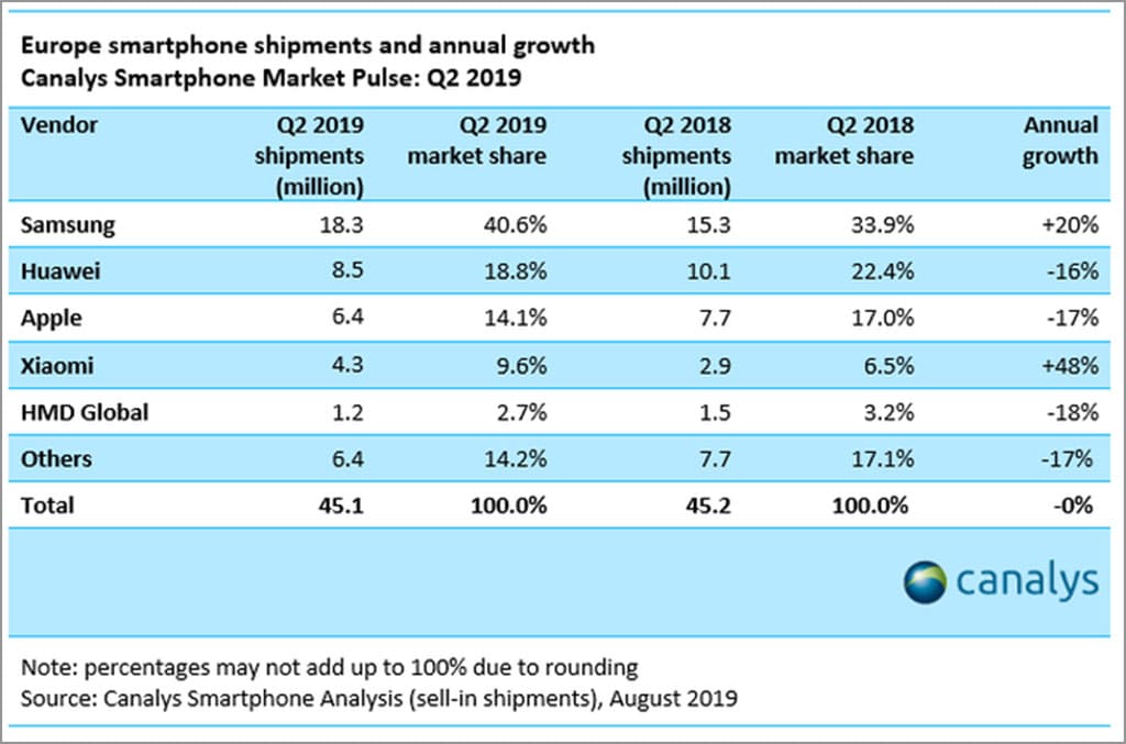 Meski posisi Samsung di kawasan Asia Tenggara terancam oleh produk-produk dari China, merek asal Korea Selatan ini masih tetap menjadi ponsel pilihan bagi warga Eropa. Dalam laporan Canalys disebutkan jika Samsung masih menguasai pasar ponsel Eropa dengan mencatat 18,3 juta unit smartphone terjual pada kuartal kedua 2019.