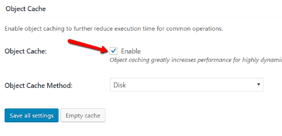 Object Cache adalah fitur lain yang mungkin tidak cukup bagus untuk dijalankan di shared hosting. Tapi mungkin tidak ada salahnya untuk mencoba terlebih dahulu, jika dashboard admin WordPress Anda berjalan lambat, silakan untuk mendisablenya.