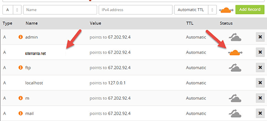 Pastikan Anda melihat ikon CloudFlare berwarna oren pada baris nama domain Anda. Itu artinya, CloudFlare akan domain Anda sudah terhubung. Jika Anda menggunakan subdomain, Anda harus memastikan juga melihat ikon yang berwarna oren.