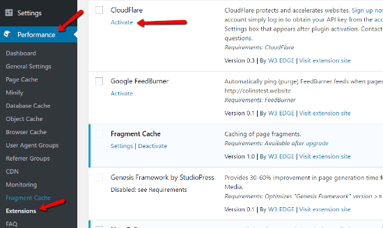 Itulah cara melakukan penyetingan W3 Total Cache, saat ini yang diperlukan adalah masuk ke bagian menu Extensions dan mengaktifkan CloudFlare.