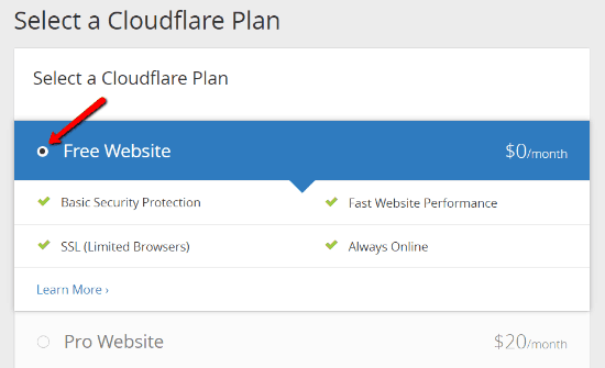 Karena postingan ini membahas cara meningkatkan kecepatan WordPress tanpa harus mengeluarkan biaya, silakan untuk memilih paket yang gratis. Untuk kebanyakan pemilik website, versi gratis CloudFlare ini cukup powerful.