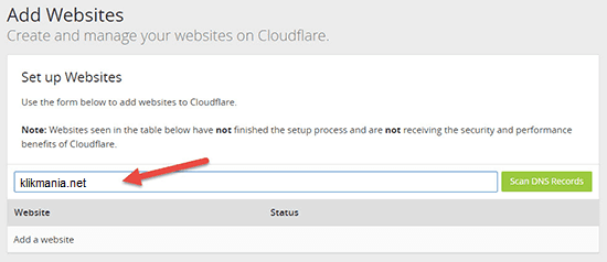 Setelah Anda berhasil membuat akun, CloudFlare akan meminta Anda untuk menambahkan website Anda. Silakan masukkan nama domain dari website Anda dan klik tombol Scan DNS Records: