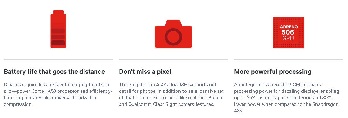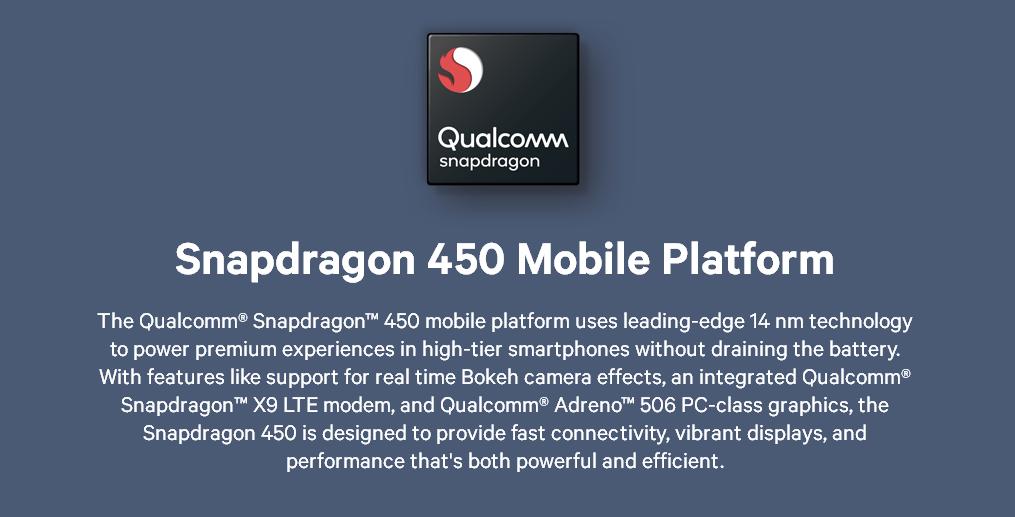 - Chipset: Qualcomm SDM450 Snapdragon 450 (Octa-core 1.8 GHz Cortex-A53 1.8GHz & Adreno 506)