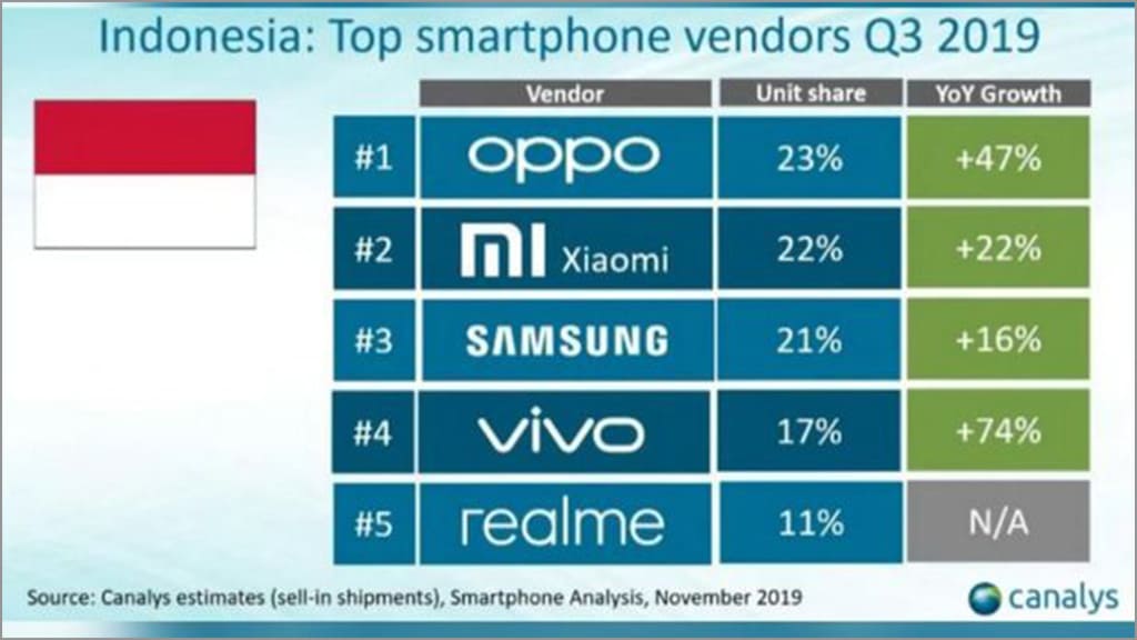 Di kuartal kedua tahun 2019 lalu, Canalys menempatkan Oppo sebagai ponsel terlaris di Indonesia dengan pangsa pasar sebesar 26 persen. Saat itu, Oppo nyaman dipuncak dengan selisih 2 persen dari Samsung yang hanya mendapatkan 24 persen saja.