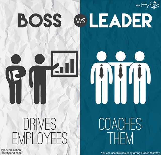 Seorang pemimpin akan memberikan contoh dan membimbing timnya dalam melaksanakan tugas-tugasnya. Sedangkan bos hanya memerintah anak buahnya tanpa memberikan bimbingan atau contoh dan hanya tahu hasil akhirnya.