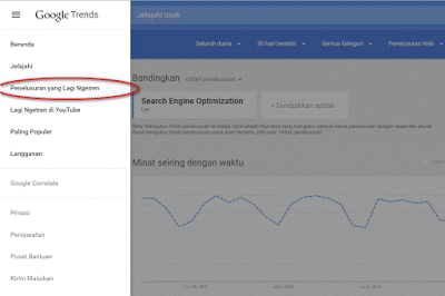 1. Buka dan simak google trend, apa yang sedang ngetrend selama bulan ini. Buka menu halaman yang sesuai dengan kategory (Niche blog anda), di situ banyak sekali ide atau bahan buat posting blog anda.