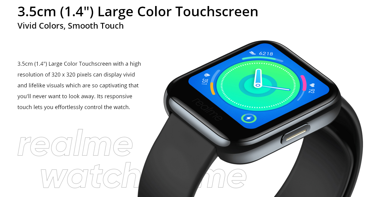 Layar Realme Watch mampu memberikan gambar berwarna yang tajam dan jelas dengan kerapatan pixel sebesar 323 ppi dan 380 nits of brightness yang dapat di-atur melalui 10 tingkat opsi kecerahan.