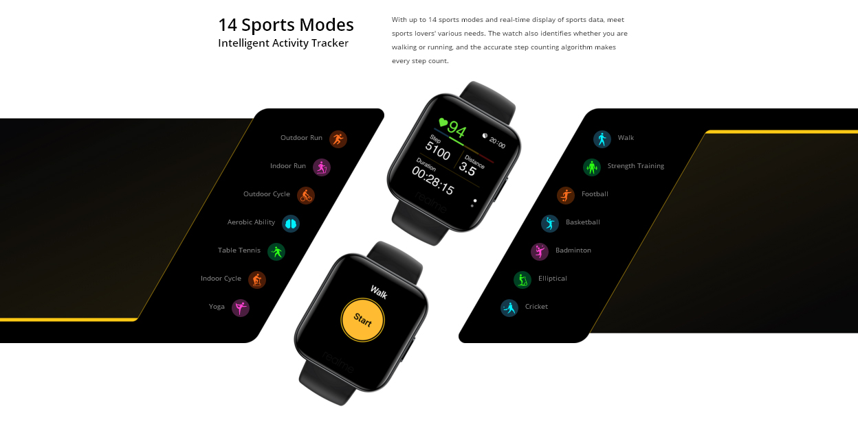 Realme Watch juga menyediakan 14 mode sport yang mencakup jogging, badminton, treadmill, aerobic, dsb.