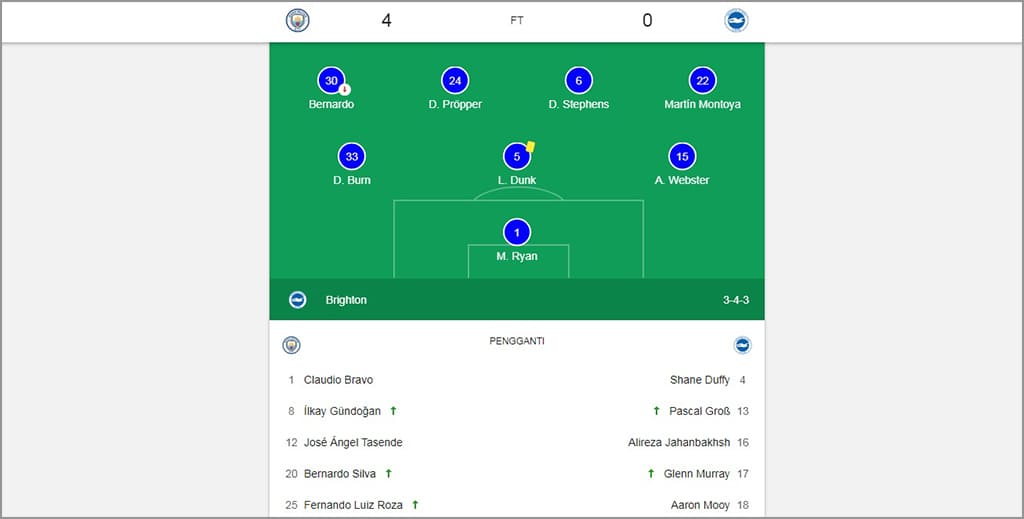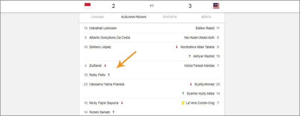 Sebenarnya, untuk melihat pergantian pemain dengan jelas juga bisa dilakukan dengan mengklik linimasa. Dengan mengklik linimasa, maka para pengguna bisa mengetahui secara jelas pemain siapa menggantikan siapa beserta dengan waktu keluarnya.