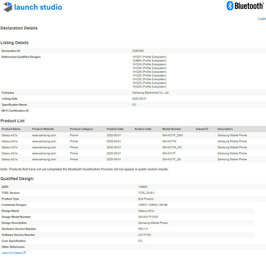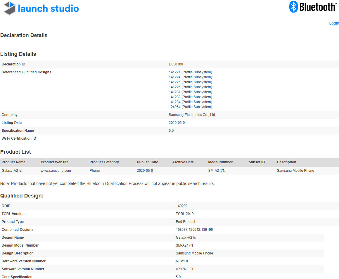 Selain itu, Samsung SM-A217F juga telah menerima sertifikasi dari Bluetooth SIG dan sertifikasi yang di-dapat mengkonfirmasi bahwa smartphone tersebut akan dikenal dengan nama Galaxy A21s.